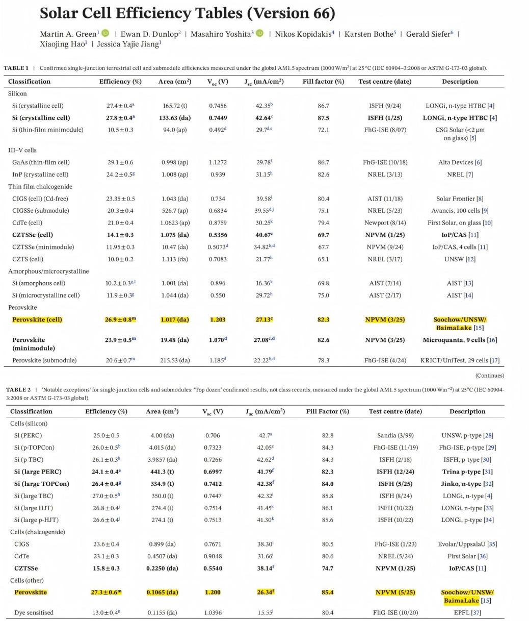 《太阳能电池效率表》(第66版)部分截图。 罗漪 提供